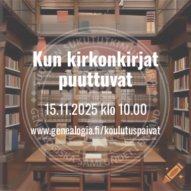 Koulutuspäivä Kun kirkonkirjat puuttuvat pidetään lauantaina 15.11.2025 klo 10.00–13.00 etäyhteydellä. Kouluttajana on FT Jukka Partanen.
