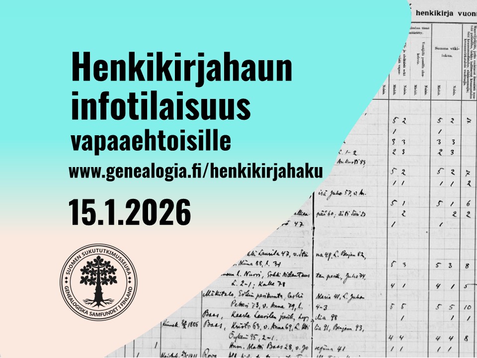 Torstaina 15.1.2026 klo 18.00–19.00 henkikirjahaun vapaaehtoinen koordinaattori, FM Mikko Kuitula esittelee verkkopalveluiden infotilaisuudessa Suomen Sukututkimusseuran Henkikirjahaun käyttöä ja kertoo sen täydentämisestä.