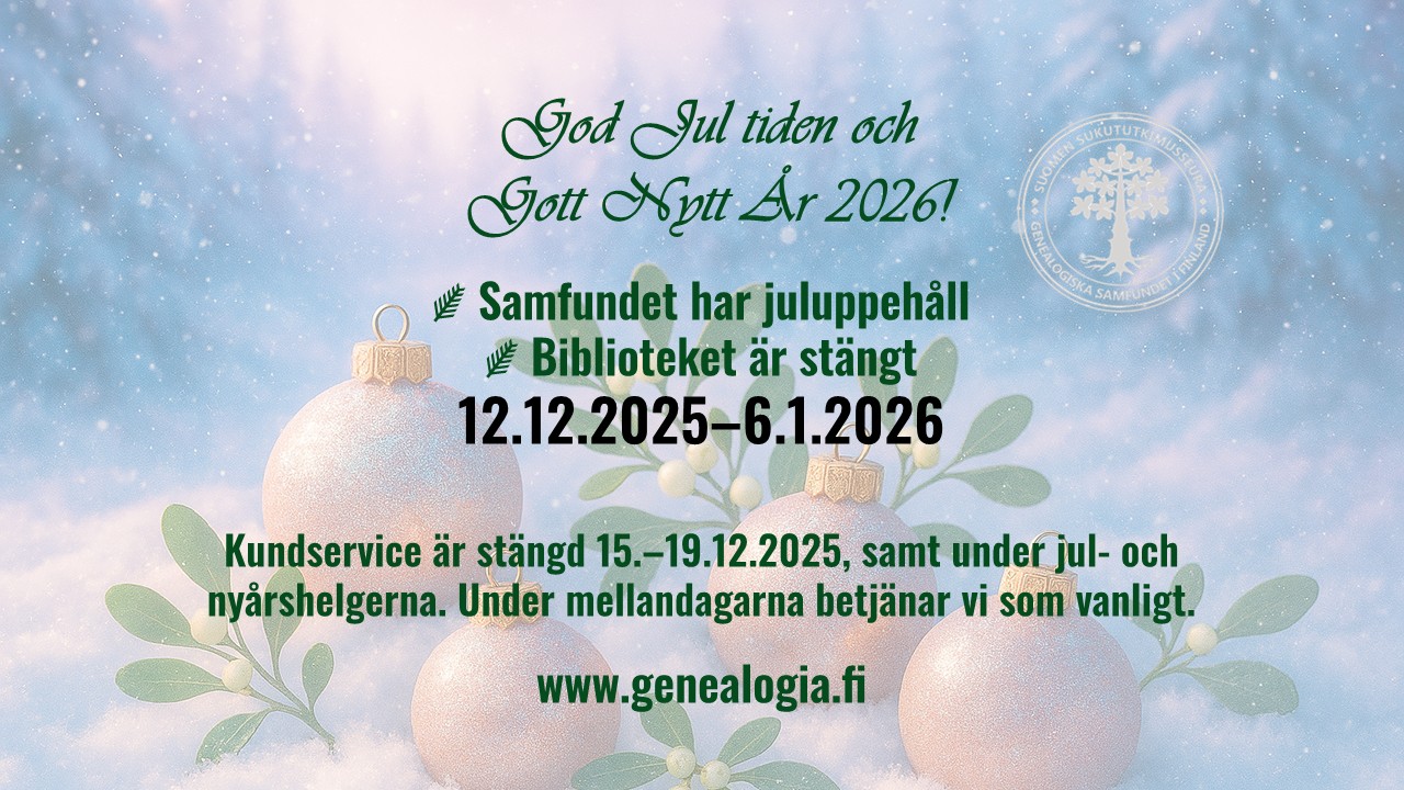 Genealogiska Samfundets kundservice och bibliotekets öppettider 12.12.2025–6.1.2026