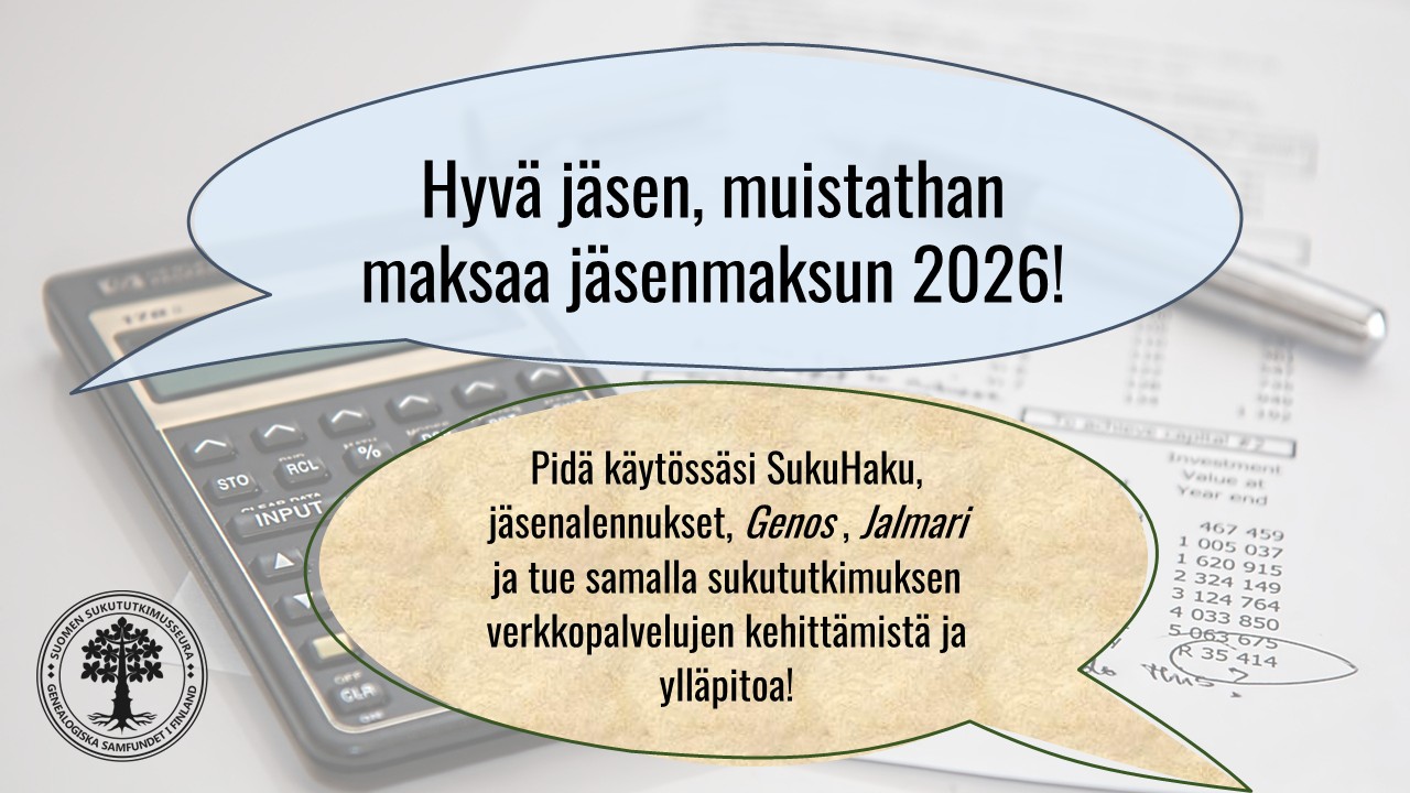 Suomen Sukututkimusseuran vuoden 2026 jäsenmaksulaskutus on alkanut ja laskujen on määrä saapua perille tammikuun aikana. Lasku lähetetään jäsentiedoissa olevaan sähköpostiosoitteeseen. Sähköpostiohjelman roskapostikansio kannattaa tarkistaa. Jos jäsentiedoissa ei ole sähköpostiosoitetta, lasku postitetaan paperisena. Jäsenmaksu maksetaan laskussa olevaa viitenumeroa käyttäen, jolloin maksu tapahtuu automaattisesti oikein.