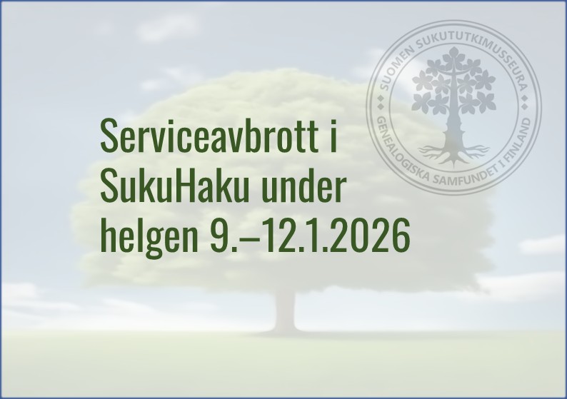 SukuHaku-portalen kommer att ha ett serviceavbrott från fredag 9.1.2026 kl. 16.00 till måndag 12.1.2026 kl. 12.00. Under denna tid är SukuHaku-tjänsterna inte i drift och det går inte att logga in i SukuHaku.