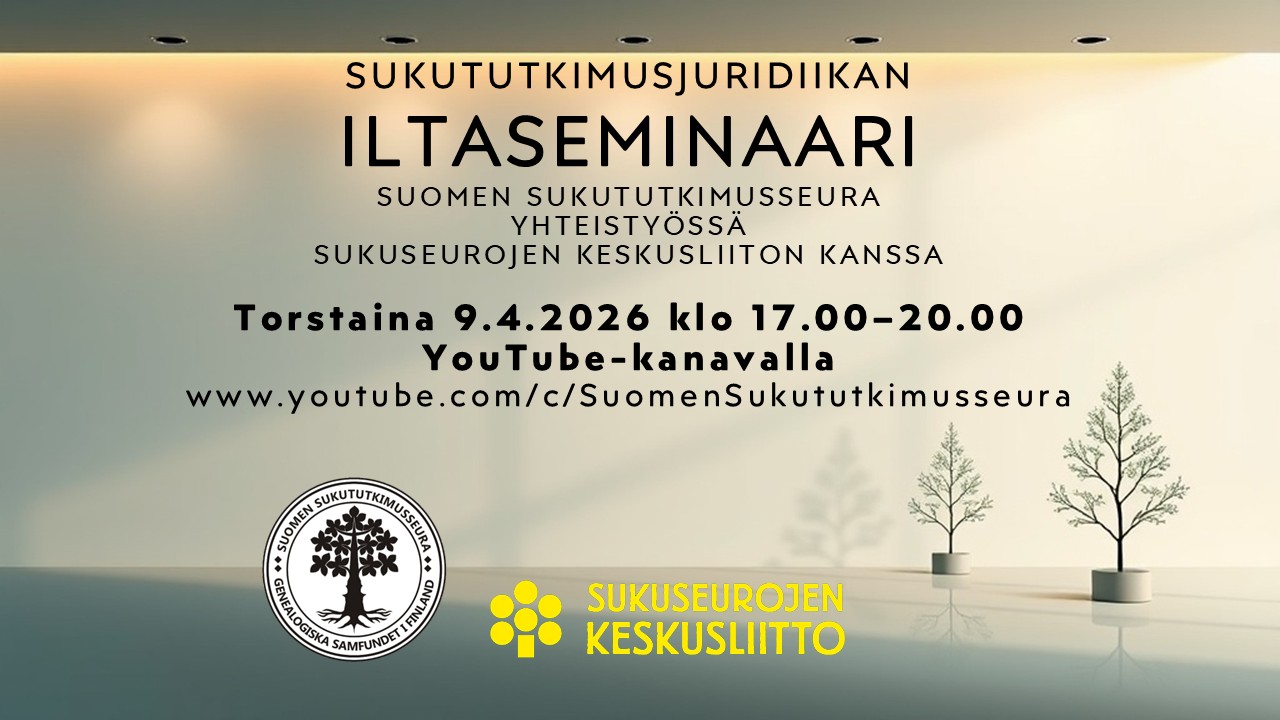 Suomen Sukututkimusseura järjestää yhteistyössä Sukuseurojen keskusliiton kanssa iltaseminaarin torstaina 9.4.2026 klo 17.00–20.00. Iltaseminaarin teemana on sukututkimusjuridiikka. Seminaari koostuu neljästä teemaan liittyvästä alustuksesta ja niitä seuraavasta lyhyestä keskustelusta. Seminaari striimataan suorana Seuran YouTube-kanavalle.