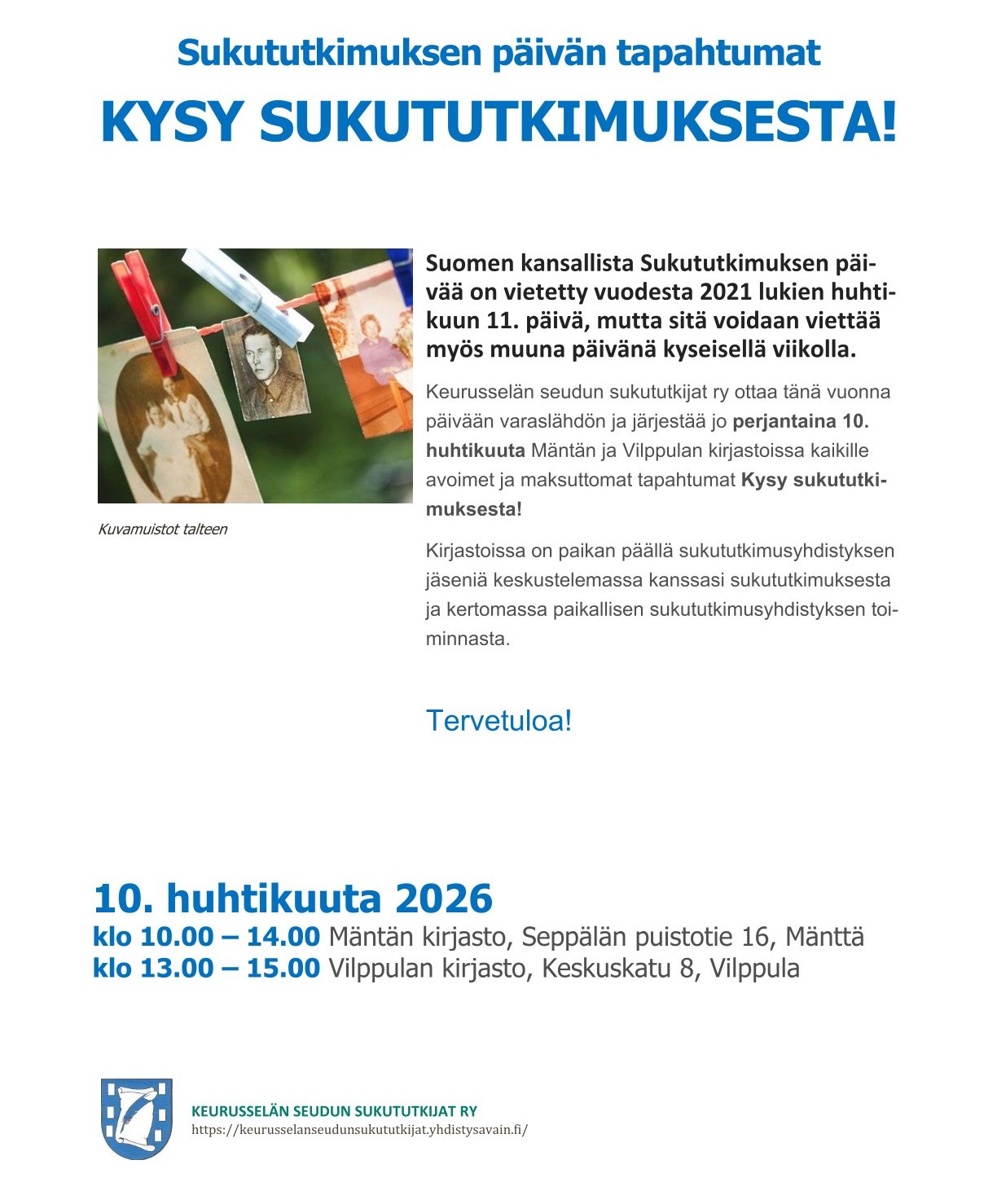 Keravan seudun sukututkijat järjestävät lauantaina 11.4.2026 klo 10.30–14.30 Kansallisen sukututkimuksen päivä -tapahtuman yhteistyössä Keravan kirjaston kanssa.