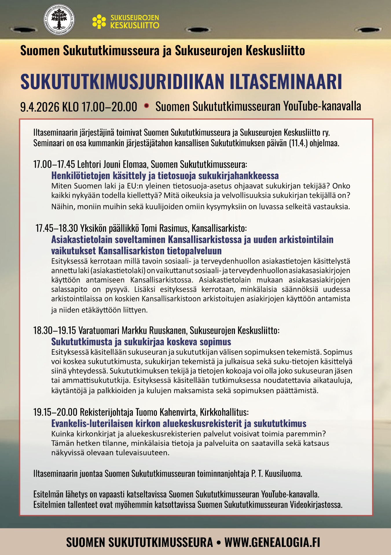 Suomen Sukututkimusseura järjestää yhteistyössä Sukuseurojen keskusliiton kanssa torstaina 9.4.2026 klo 17.00–20.00 Sukututkimusjuridiikan iltaseminaarin Suomen Sukututkimusseuran Youtube-kanavalla. Seminaaria voi seurata suorassa lähetyksessä kanavalla.