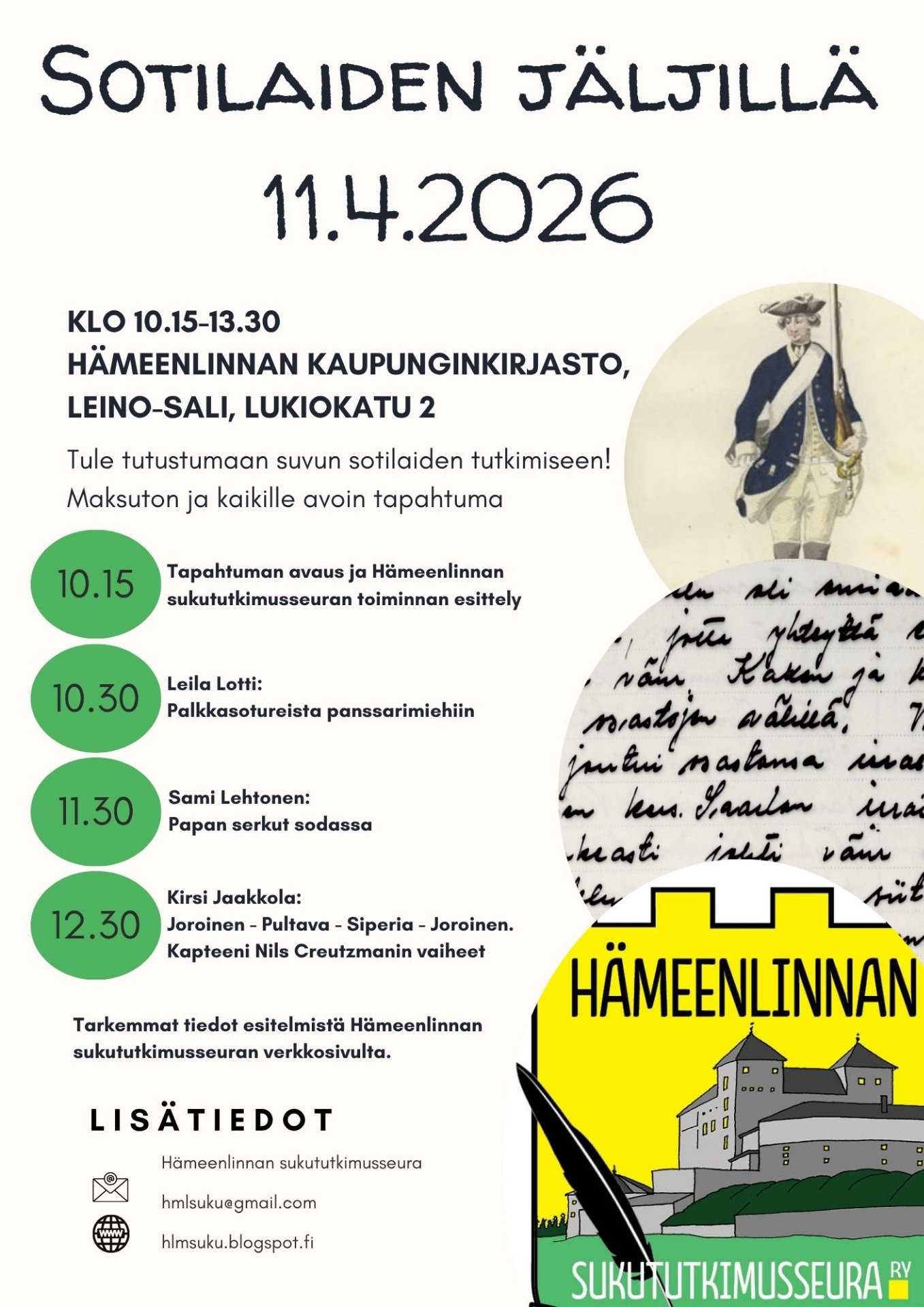 Hämeenlinnan sukututkimusseura järjestää kansallisena sukututkimuksen päivänä kaikille avoimen ja ilmaisen tapahtuman teemalla Sotilaiden jäljillä, lauantaina 11.4. klo 10.15-13.30