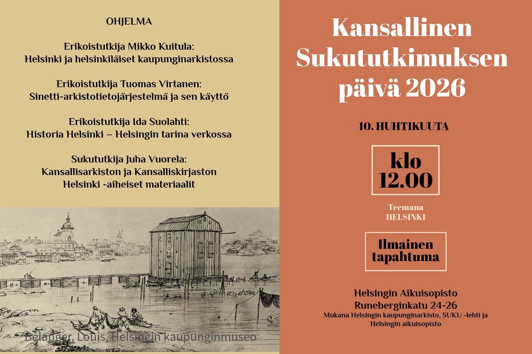 Kansallinen Sukututkimuksen päivä Helsingin aikuisopistolla perjantaina 10.4.2026 klo 12.00. Järjestäjänä SUKU -lehti.