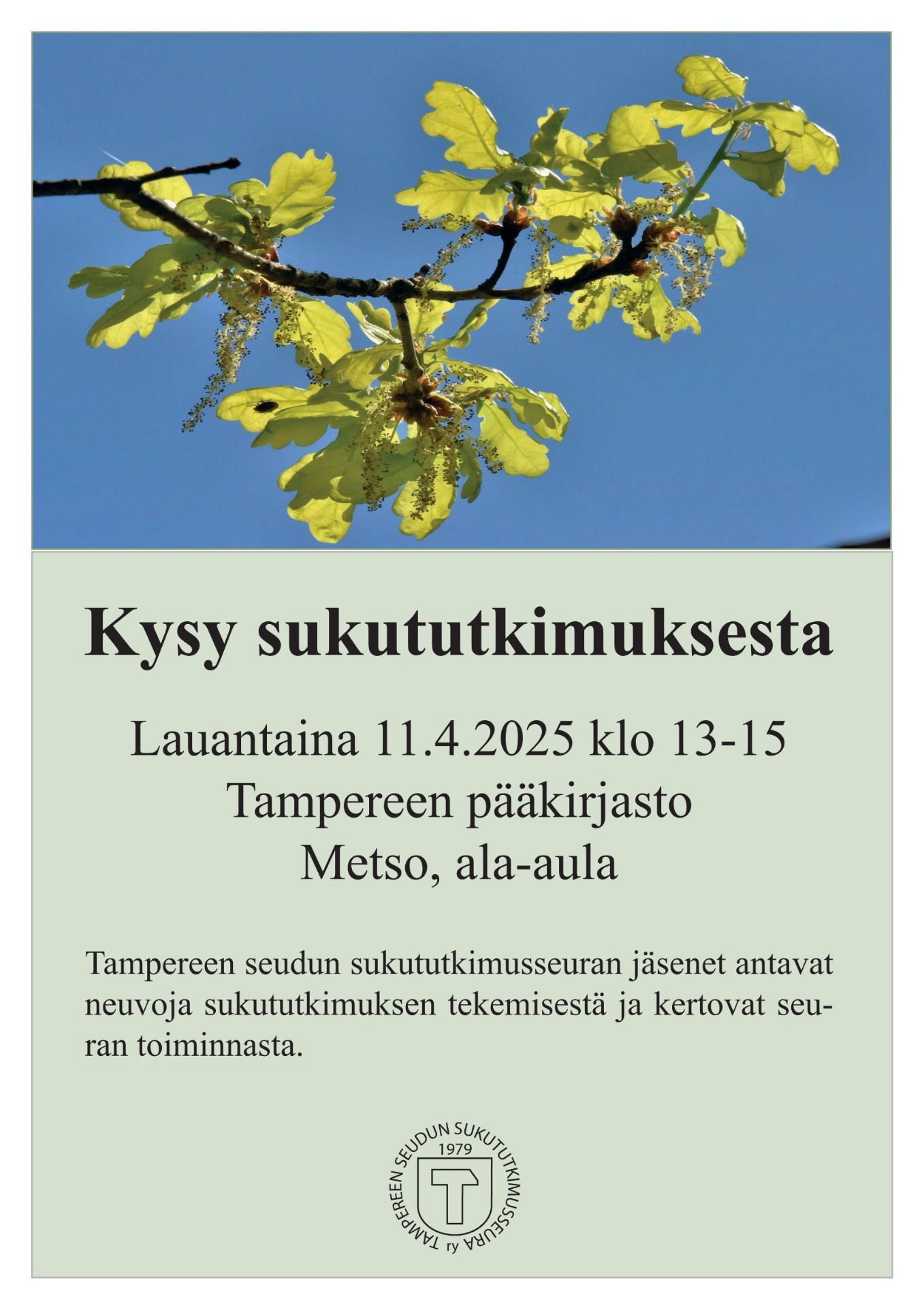Tampereen seudun sukututkimusseura järjestää avoimen infotilaisuuden sukututkimuksesta Tampereen pääkirjasto Metsossa lauantaina 11.4.2026 klo 13.00-15.00. Annamme neuvontaa sukututkimuksen teossa ja kerromme seuramme toiminnasta.
