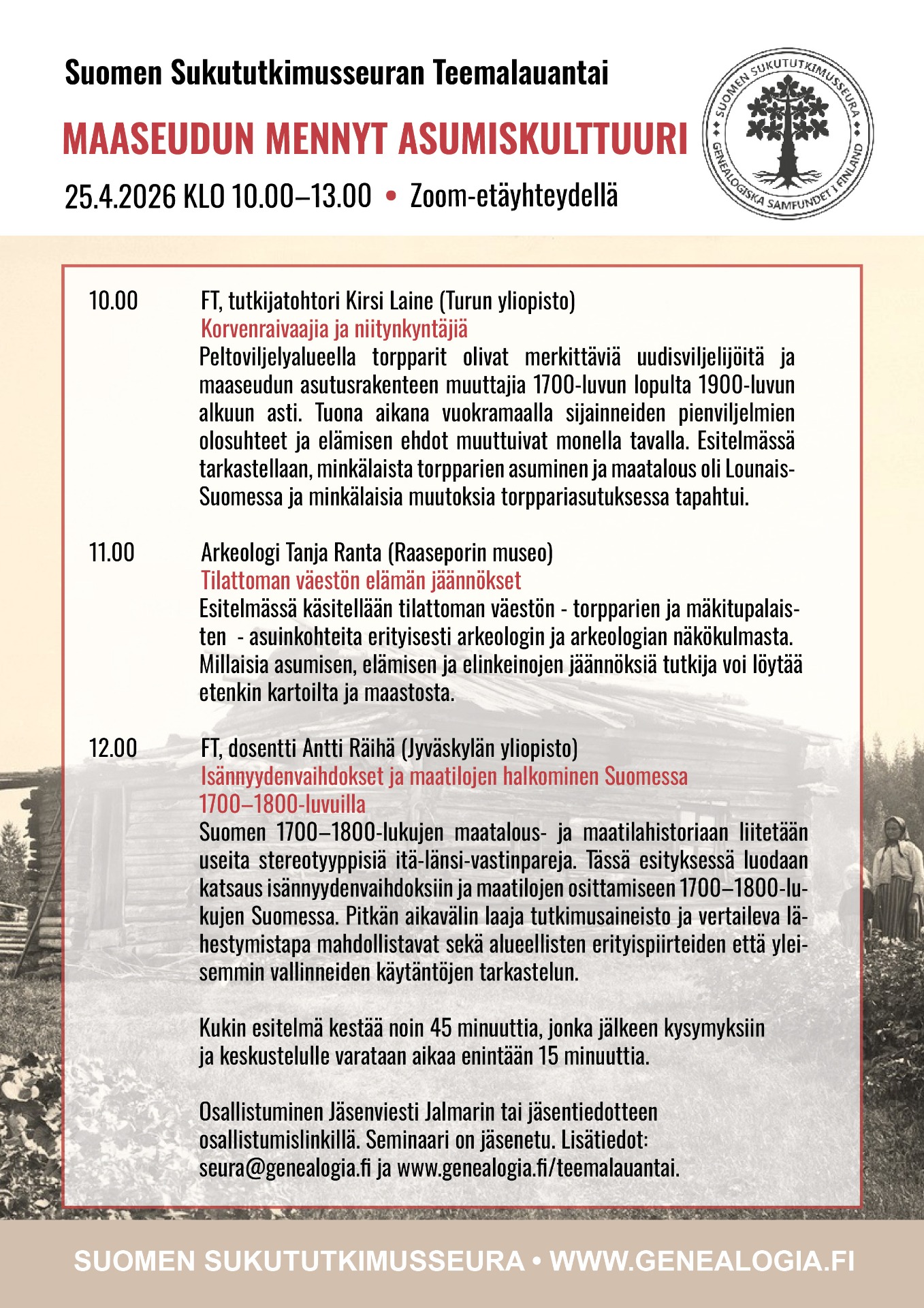 Kevään 2026 Teemalauantaita vietetään 25.4.2026 klo 10.00–13.00 etäyhteydellä teemalla "Maaseudun mennyt asumiskulttuuri".